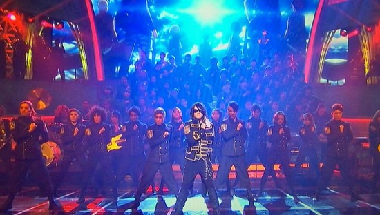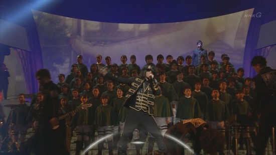 A group of singers dressed in the Attack on Titan anime's Survey Corps uniforms performed the choral portions of the song “Guren no Yumiya (Kōhaku Special Ver.)” with Linked Horizon.