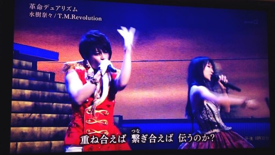 Nana Mizuki and T.M. Revolution also performed a combined version of the two Valvrave the Liberator opening themes, "Preserved Rose" and "Kakumeiki Dualism" (Revolutionary Dualism). Both singers wore outfits that changed from red to white during the performance.