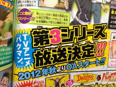 Next year's combined 3rd/4th issue of Shueisha's Weekly Shonen Jump magazine is announcing on Monday that a third television anime series based on Takeshi Obata and Tsugumi Ohba's Bakuman. manga has been green-lit for Fall of 2012.