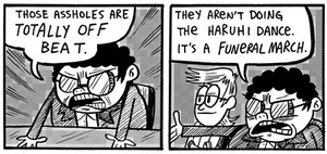 Here's the thing: a few months back, some of my friends and I started to wonder if anime clubs still served any purpose at all. After all, anime was easy to get, and anime fans weren't that hard to find, either. So why expend the effort and resources organizing screenings that may or may not be populated by literally crazy people? My intrigue with the question came to a head after reading KC Green's superb Anime Club comic strip, which highlights both good and (usually) bad aspects of club participation. Amazingly, Green didn't draw on his own experiences. He elaborates: "None of The Anime Club is based on personal experience. I made up the story one night a year and a half ago and the characters all kind of started as basic stereotypes I knew of from the world of anime fandom. The most "research" I did is to lurk horrid image boards and other forums and remember back to a group of people I knew of in high school who sort of acted like that. I just exaggerated it up for comedic effect." In spite of that, The Anime Club's tales of colossal nerd-fights over proper terminology and nuances of children's cartoons, the awkward but undeniable sense of belonging fans feel at these meetings, and the regular ousting of prickly, out-of-touch "club elders" by new blood suggest experience, and resonate with this longtime club attendee.