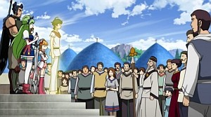 Ixion Saga DT is a funny show, but it strafes a little too close to that shady area of comedy where real jokes are replaced with subculture references. Although even non-gamers might find the show enjoyable, a lot of its non-slapstick gags are written towards gamers, cutting corners in the way that only nerd reference humor can. There's an extended gag where Kon is mistaken by a group of people for a god. Naturally, he uses it to his full advantage, basking in the gifts and special treatment that he receives. When they ask him to tell the history of the world, though, he spits off a list of game consoles, which is only funny in that, “Yeah! I get what he's talking about!” kind of way. It's like those genre parody movies that pop up on the big screen every couple of years.