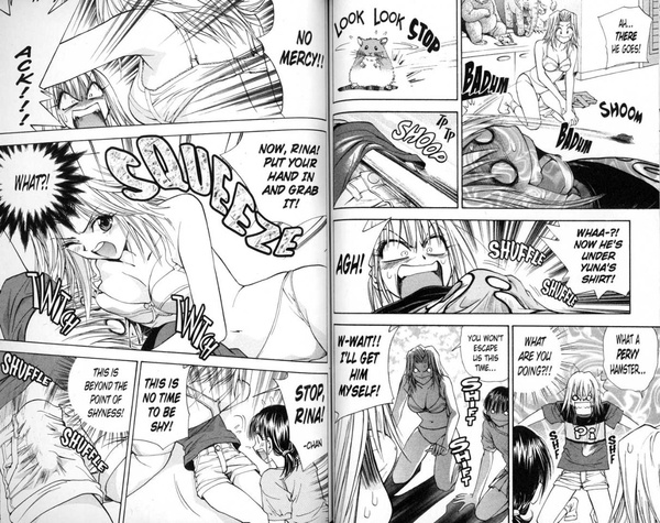 Like Midori Days, there aren't many long story arcs; most of the stories are just one chapter long. After Manabe, Rina and Rando, most of the characters have just one or two traits, but since it's a gag manga, that's all they need. There's Rina's three friends Keiko (the butch sporty girl), Midori (the big-breasted girl) and Yukie (the 'mature' girl, except when she's short-tempered). miwa, the 23-year-old teacher, is the sexy-older-woman type. Nozomi, a lesbian girl (cue yuri jokes), shows up in volume 3 and starts hitting on Rando, whose combination of macho strength and womanly looks makes her knees go weak. Volume 4 introduces Natsuo, a tomboy who used to be Rando's martial arts pupil, and who's always doing high kicks wearing a short skirt. (Author's note on Natsuo: "From the start, she's functioned as a panties character, but she's really proud of her ample breasts.") Except for Natsuo, most of the side characters don't have much to do except kinda hang out in the background while Rando has nosebleeds and struggles to keep his clothes on.