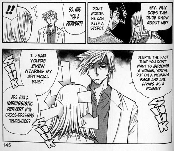 One thing I like about this series is its willingness to go into the creepy areas. Kano has said that he likes dark stories, and you can see that in the alternate endings in the omake in volume 6 (too bad he didn't use them instead of the actual ending, which is sorta weak). The idea that his parents think he's dead and have moved away is pretty sad if you think about it, although the Jump editors vetoed Kano's original idea that Rina's sister Yuna had been kidnapped, instead of running away from home like she did in the final version of the manga. For that matter, the whole premise —a guy gets plastic surgery to look like a girl's twin sister—is oddly similar to the 1970s Fritz Leiber horror story "Dark Wings", except that in that story, the guy really is a stalker, and things don't end well. It's interesting that Kano (whose stories usually involve magic) grounds the series in "real" medical sex change operations, instead of the usual manga devices like magical hot springs, aliens giving you a sex change, etc. In the original draft, there were even more specific trannsexual references: Manabe removed Rando's body hair with electrolysis, and one chapter would have involved him starting to grow breasts (but Kano writes "this story makes you think of hormone shots and takes your thoughts in a dangerous direction, so it's probably best that it was rejected.") The very idea of plastic surgery is a little bloody and uncomfortable, and there's also lots of blood and distorted faces in the fight scenes. For cheap gags, take the scene in volume 1 when Rando comes home with his head covered in blood, after head-butting six guys unconscious. "Yuna! What happened?!? You're bleeding!!" his/her parents cry out. "Um…" he answers, "My period…?" Or, the scene when Dr. Manabe's friend psychoanalyzes Rando. "So, despite the fact that you don't want to become a woman, you've put on a woman's face and are living as a woman? I hear you're even wearing an artificial bust. Are you a narcissistic pervert with crossdressing tendencies?"