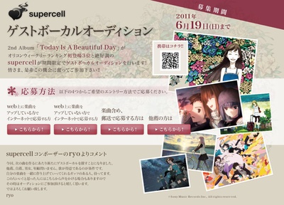 The musical group supercell began holding auditions on Wednesday for a guest vocalist on the group's third album. The winner will follow in the figurative footsteps of the virtual Vocaloid idol Hatsune Miku and the human singer nagi, who performed on supercell's first and second albums, respectively.