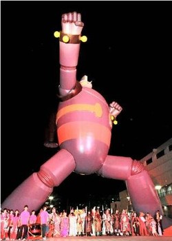 The city of Kobe lit up the "life-size" statue of Mitsuteru Yokoyama's Tetsujin 28-go (IronMan 28 or Gigantor) robot in 40 pink lights on Sunday in honor of Breast Cancer Awareness Month. The event was held as a part of the city's "Pink Ribbon Festival" to raise awareness about the early detection and treatment of breast cancer.