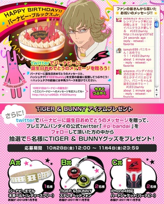 Bandai's online store marked the birthday of Tiger & Bunny character Barnaby on October 31 by holding a Twitter campaign. The Premium Bandai store asked people to follow the @p_bandai Twitter account and wish Barnaby a happy birthday with the "#1031bunny" hashtag between October 28 and November 4. Premium Bandai will then give a Barnaby's Real Leather Belt (one size fits most ladies), two Tiger & Bunny Stereo Headphones, and two iPhone 4 Hard Jacket Cases (Barnaby version) to five randomly selected well-wishers. (Prizes can only be sent to Japanese addresses.)