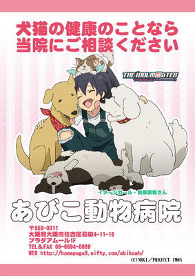 The Abiko Animal Hospital in Osaka revealed that it joined forces with Namco Bandai Games and Aniplex to create a poster featuring The IDOLM@STER character Hibiki Ganaha. The poster encourages owners to consult with the hospital for the health of their dogs and cats. In The IDOLM@STER games and anime, Hibiki has a hamster, a dog, and many other pets — but partly due to her bad habits as an owner, some end up leaving from time to time.