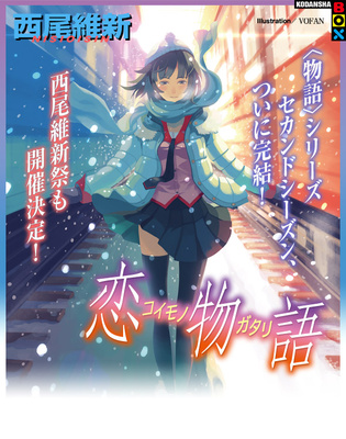 Kodansha also confirmed that Koimonogatari (pictured right), the last book in the "second season" arc of NisiOisin's Monogatari novels, will ship on December 22. To celebrate this, Kodansha is holding a "NisiOisin Festival" campaign by offering special goods to people who buy certain NisiOisin books, the Bakemonogatari Blu-ray Disc Box, or the complete Bakemonogatari Songs & Soundtracks collection. Kodansha is also selling a 2012 school calendar with all 12 Monogatari cover illustrations from the first Bakemonogatari book to Koimonogatari.