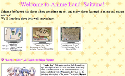 Saitama, the Japanese prefecture just west of Tokyo, has launched a trilingual version of its sightseeing web guide for foreign anime fans. Visitors can learn more about the shrine popularized by Lucky Star, the Crayon Shin-chan amusement facility, and the forested hills that inspired My Neighbor Totoro's backdrops — in English, Korean, or Simplified Chinese. The site is intended for the many visitors from Korea, Taiwan, China, and elsewhere that visit the prefecture due to the settings seen in anime. Echoing the "Yokoso! Japan" ("Welcome! Japan) campaign of the national government, the website is titled in three languages, "Welcome to Anime Land, Saitama!"