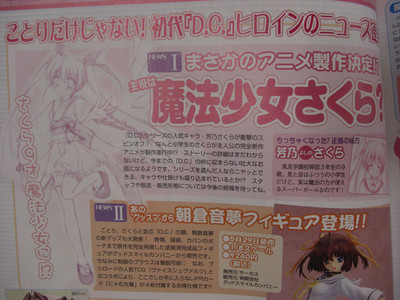 An all-new anime spinoff based on the Sakura Yoshino character from the first game in the D.C. ~Da Capo~ franchise has been green-lit. Sakura's starring role in the new anime is described as "Mahō Shōjo Sakura" ("Magical Girl Sakura"). The announcement depicts Sakura as a seemingly ordinary 9-year-old third grader in Kazami Academy's elementary school — except she is actually a "super-girl" who can invoke magical powers.
