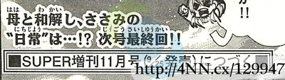 The October issue of Shogakukan's Shōnen Sunday S magazine announced at the end of the latest chapter of Akira Nishikawa's manga adaptation of Akira's Sasami-san@Ganbaranai novels that the next issue will publish the final chapter of the manga. The November issue is scheduled to ship in Japan on September 24.