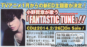 The third 2014 issue of Shueisha's Weekly Shonen Jump magazine is announcing on Monday that voice actor Kenshō Ono is contributing his song "Fantastic Tune" as the new ending theme song for the Kuroko's Basketball television anime. The theme will begin playing in the anime in January. The CD with "Fantastic Tune" and another song will go on sale in standard and limited editions on February 26.