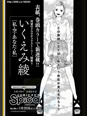 The 29th issue of Gentosha's Comic Spica magazine announced on Friday that Ryo Ikuemi (Pops, Honey Bunny!) will begin serializing her new manga titled Watashi-Sora-Anata-Watashi (Me-Sky-You-Me) in the 30th issue of the magazine, which is scheduled to be released in Japan on March 28. The magazine describes the manga as “the long-awaited dramatic story,” and the page features the text, “I wonder... In which exact moment will I be able to see the existence known as me?”