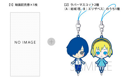 Participating theaters are now selling advance tickets with one of four randomly distributed character clear file folder/Persona leaflet sets. Jika Net Tanaka and the AnimeJapan event are also selling a set with an advance ticket and a CD with the theme song, while Animate and Gamers stores are offering two different limited-edition sets with an advance ticket and character goods (one of two mobile phone straps with rubber mascots, or an A3 clear poster with an exclusive illustration).