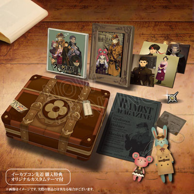 The e-CAPCOM limited edition (pictured above) will include a case shaped like Sherlock Holmes' "private trunk" (briefcase). The version will also bundle mini Sherlock Holmes and Iris Watson plushes, a set of six postcards, an A5-size notebook with a The Randst Magazine design, a Holmes business card sticker, and Ryūnosuke Naruhodo's university pin. The e-CAPCOM limited edition will cost 9,300 yen (about US$78).