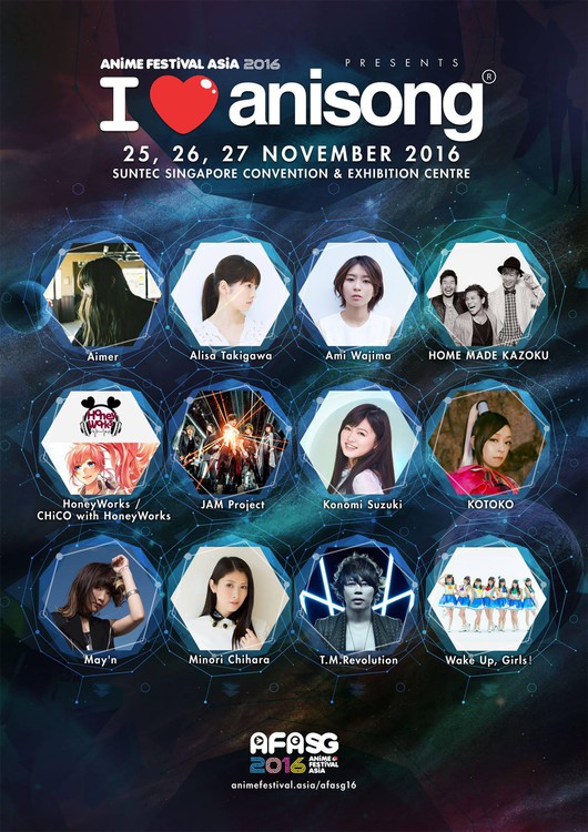 AFA Singapore will take place at the Suntec Singapore Convention & Exhibition Center on November 25-27. Previously announced musical guests include Aimer, Ami Wajima, HoneyWorks/CHICO with Honeyworks, Home Made Kazoku, JAM Project, May'n, Minori Chihara, T.M. Revolution, and Wake Up, Girls!.