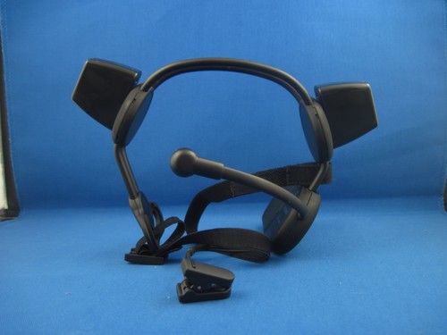 The bare headset, out of the box. The protruding arm is the first contact with your face: it has to be adjusted to rest gently on your forehead. The second is a tweezer-like clip that goes onto your ear. The box (and the promotional video) avoid mentioning this stuff. We first unboxed this thing in the gift shop of a Cracker Barrel, by the way. (Our waitress was jealous.) Sorry I didn't think to take pictures of my friends and I taking turns putting them on and laughing, laughing, laughing. Fans of Vertical's Ed Chavez will likely never forgive me.