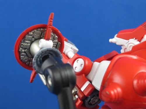 Accessories are quite light, but the loving mechanical detail on them is not. The main piece is Blodia's huge shield/cannon, which snaps onto the arm. The way this works-- completely undocumented, by the way-- is that a connecting gimmick can be pulled right out of the arm and plugged into the shield. From here, the shield actually has its own independent range of movement from on top of the arm. It's very finicky, but it's also very clever stuff.