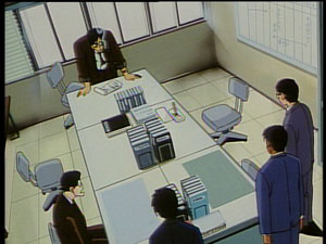 Nerdy self-references abound, from the staff of Patlabor (some of which are reincarnated here into members of the anti-Demon Seed task force) to Yuuki's other comedy series Ultimate Superman R. (R is a super-powered cyborg high school kid who happens to be a mouth-breathing, tall gangly nerd. Look for his own OAV in a future Buried Treasure installment.) Yuuki draws himself as the task force's requisite otaku -- porn obsessed, lisping and barely capable of coherent thought. Other laughs are to be had at the show's stabs at product placement, involving a very silly live action sequence.