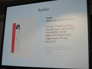 Chavez then introduced three new "mystery" titles that will be announced down the line. The first one is "Manga Title: T" that will be released on 7/19/2011. It will be 436 pages. And "Manga Series M," from the same publisher as "Manga Title T." Manga Series M will be released on 09/20/2011 and will be 216 pages. Manga Series M will be released bi-monthly. Chavez said he hopes to officially announce both of those titles at New York Comic Con. There is also a mystery Tezuka series that will be released on 07/26/2011. There is no news yet as to when that Tezuka title will be officially announced.