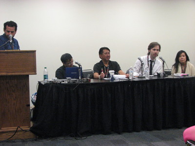 Marketing Assistant Loy Fruel, Marketing Manager Robert Napton, and President Ken Iyadomi hosted the Bandai Entertainment industry panel on Saturday morning. The panel started out mostly full, but as time went on it became completely packed, leaving attendees to stand throughout the panel.