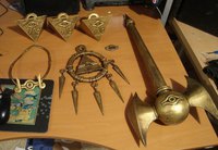 Once your prop is built, it's time to paint! Never underestimate the important of a good paint job. It can hide flaws and show off details—it's what will bring your props to life. Try shading, layering colors, dry brushing, and even using markers to outline details. Everything can be a useful tool, as long as you're creative enough. It's a good idea to prime the prop before applying the final paint job. That means first painting the piece either solid black for darker props, or solid white for the lighter ones. It definitely helps the final product look much more even in the end. Personally, I've always liked to use acrylic craft paints, the ones that come in the little bottles. Some people will tell you that certain brands are better than other ones, but I've just always used whatever is on sale, and it's always worked out pretty well for me. When it comes to metallic paint, I've found that Plaid's FolkArt brand works rather well, but there's no one certain brand that I'll always use for all my paint jobs. If a prop calls for a clear coat finish, I'll paint varnish over it, but it depends on what kind of look I'm going for.