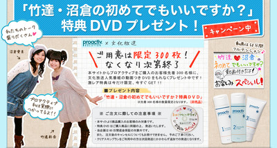 Ayana Taketatsu, the voice actress best known for playing Azusa in K-ON!, and fellow voice actress Manami Numakura (The IDOLM@STER's Hibiki Ganaha) star in a Japanese campaign for Proactiv Solution, the anti-acne treatment from the United States. In this joint effort with the radio network Bunka Hōsō, the first 300 people who buy the treatment online will receive a 50-minute DVD of Taketatsu/Numakura no Hajimete Demo Ii Desu ka? — the radio program that the two voice actresses host.