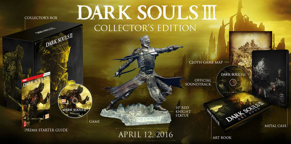 The "Collector's Edition" in Europe will include: the game, a Red Knight figurine, an A4-size Dark Souls Trilogy hardcover artbook, a metal case, a soundtrack, three iron-on patches, a cloth game map, and an exclusive box.