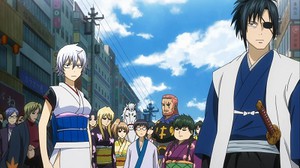 In a humorous turn of events, all of the affected residents of Kabuki-cho have their genders restored—with the unfortunate exception of the main cast. Since most of the show's female regulars are skilled fighters with no shortage of confidence, they fall into their roles as men without skipping a beat. However, upon the urging of bishonen Tsukuyo, the newly-female Shisengumi decide to give up law enforcement and work as naughty policewomen in Yoshiwara. To be fair, it's likely meant as a dig at the men's general ineptitude, but the joke seems like a jab at women too, since the characters are capable as male police, but only worthy of donning "sexy policewomen" costumes as women. (Except for the sadist Sougo, who appropriately goes into the dominatrix business with submissive Sa-chan.) Rather than take things sitting down, Ginko goes on a quest for answers, while the other two thirds of the Odd Jobs Trio dedicate themselves to becoming stronger. Ginko soon discovers a way to cure the series' key players, leaving Kyubei to make the toughest decision of her life.