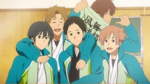 It isn't only the boys who grow closer to one another; we also gain a deeper understanding of the kyudo team. Through dull and repetitive tasks like early-morning weeding, each character shows a new side of himself. (It's particularly funny to see the normally put-together Seiya falling asleep on his feet.) None of the boys are particularly happy with this arrangement, which leads to some earnest feelings coming out, especially as Onogi and Minato finally reach a mutual understanding. Through a one-on-one conversation with Nanao, Minato realizes on his own how alike he and his self-proclaimed nemesis are, even as Onogi's best friend throws him under the bus. (“Kacchan makes finding his good side a real challenge.”) This culminates in a desperate jump for Nanao's baseball cap, which Minato thinks must be important because it is a gift from Onogi—and the earnestness of his feelings finally get through to Onogi himself. This is barely a plot, and yet everything changes afterward. By the time Tommy-sensei announces the firing order, it's common sense to all of us why Onogi is in front and Minato is in back—Onogi's confidence, conveyed through his stance, will pass like a contagion through the team, and Minato is finally at a place to accept that support.