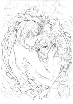 I wanted to go a little Mucha on this piece mostly for the flowers. I had the image in my head that they were laying on bed sheets surrounded by flowers, I thought this would give the piece a very dreamy feel. The circular graphic around them is to just kind of hold the focus in around them, and I just find those types of elements really appealing.