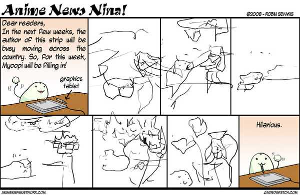 Special announcement: Anime News Nina author Robin Sevakis is on hiatus for a variety of life-changing reasons, but she will return on August 6th to provide you with more Nina goodness. Starting next week we'll have a very talented guest artist on board who will fill in those lonely Wednesday mornings for you with all-new, Robin-approved strips!