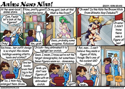 "Oh anime and anime figurines! You're so awesome despite having sometimes questionable depictions of women, to the inner-turmoil of some feminist/progressive-minded folk everywhere! I have a female friend (I won't name names) who says that if someone saw her shelves full of sexy anime statues, they'd think she had major issues with women. Not to say that everyone who collects figures has lady-issues of course, but I think it's healthy to be able to criticize and analyze things that you love. Anime has such loveable bad ass female characters that, even if you don't think they can be taken too seriously with over-emphasized, well-sculpted camel toe (or want to see them in that light), sometimes you just have to own their 3d depictions anyway. I was thinking of my friend when I made this strip. (And myself)."discuss this in the forum (27 posts) |