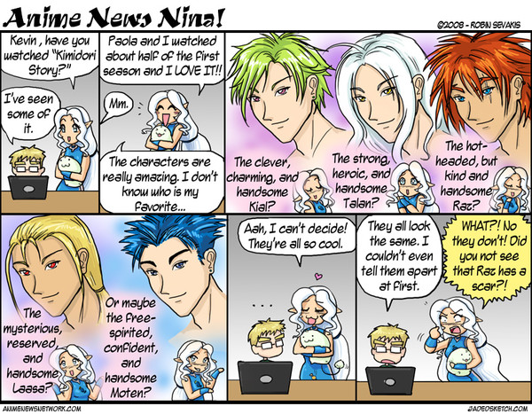 "The idea for this strip came up while I was watching The Story of Saiunkoku, and was initially a little frustrated that the male cast were practically identical except for their hair style and color, especially because that show isn't even a romantic harem show, but simply has the window dressings of one. Of course despite this, perhaps a little shamefully, I eventually became attracted to these characters anyway. While sameness in character design is a valid critique, sometimes I feel like the artist who unfairly gets accused of this the most is Yuu Watase. Sure, it's kinda true that all her bishounen essentially have the same face, but I don't really think this is any more true of her work than the majority of other mangaka. The problem is that anime and manga usually feature the artist's idea of ideal beauty (the most ideal eyes, the most ideal face-shape, etc), so even with an extremely talented character designer like Toshihiro Kawamoto (who is quite capable of drawing diverse looking people), all of the attractive female characters are going to look the same. So, unless it's bad enough that you can't tell characters apart, this bit of criticism doesn't really bother me when enjoying anime and manga."