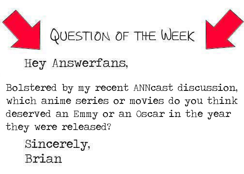 Basically, we're turning the tables. Each week I'm going to ask you a question, and I want you to email me your answer. Be as honest as you can. I'm looking for good answers; not answers I agree with or approve of, but good, thoughtful answers. People feel passionately about these subjects and I'd like to see that in the responses I get. I'll post the best answers I get, and maybe some of the crappy ones. Sometimes there may only be one or two good ones; sometimes five or more. It all depends on what I get in my inbox! Got it? Pretty simple, right? Start writing those answers and email them to answerman [at] animenewsnetwork dot com.