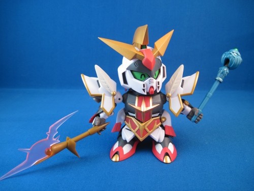 Hey kids! Remember Nu Gundam, from Char's Counterattack, the Gundam movie that says the most and shows the least? (No? Probably not?) Don't you love Yutaka Izubuchi's 80's-sleek, back-to-basics Nu Gundam ? What if Nu Gundam was both a wizard and also very short? Yeah, I never really gave it any thought either. But here it is! You can see that they've splashed a little more red on Nu, turned the yellow to gold, and given the armor a more medieval flair overall. The design is much flashier than the original Nu Gundam, but not quite as gaudy as SD Gundam typically is (now if you want gaudy, here is an SD Gundam that wears a giant blade-tongued skull on its back. So metal!). Wizard Nu is almost regal.