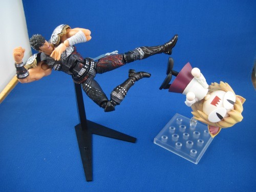 Ken's available at Right Stuf for $36 before shipping right now, which is a good price. And hey, you can also get “that one scene where Ken wears goggles and short sleeves” Ken, or shirtless Ken. If you're into belts, zippers, fire, and experience grinding, other Musou-version Revoltech figures exist for much of the major HnK cast, like Raoh and Rei.