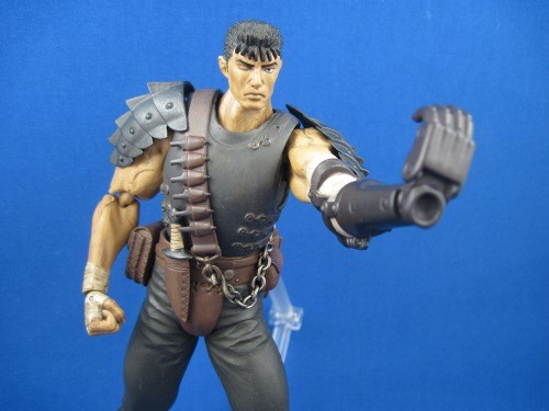 Extras include a single other facial expression-- teeth clenched with rage-- to complete the range of Guts' emotions and the usual assortment of hands. The stand is very slightly different from usual this time, with a smaller black peg that reaches over the pouches on the back of Guts' belt.
