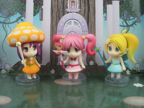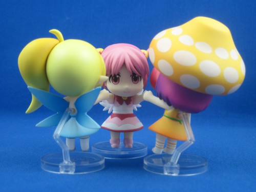 Respectively, they are pkpk (“pikupiku”), krkr (“korokoro”) and shrshr (“shirushiru”). You can see that this isn't the kind of figure we normally cover here at Astro Toy. We deliberately avoid tiny stuff like this at the column (see gashapon, trading figures, UFO catcher stuff) because there's usually so little to say about it. The fairies stand a little under two and a half inches tall each. Due to tiny feet and huge heads, they will definitely not stand without the assistance of the included tiny little stands.