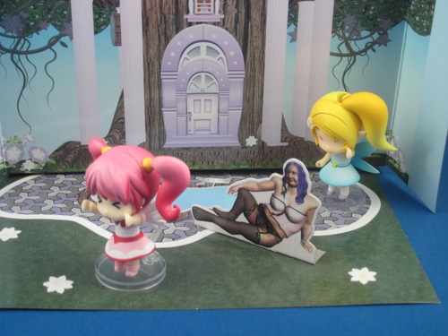 Of course you've got to set them up in the magical fairy forest backdrop where most of the show takes place. The “floor” is a nice heavy sheet of paper: you can also use a sheet depicting the lake where the fairies like to watch CG shorts more surreal than their own and ad-lib dialogue. The tree stump around which they usually sit and talk is a simple papercraft: you'll need some strong glue. Man, you guys remember the last time I did papercraft? I, uh, don't wanna talk about it.