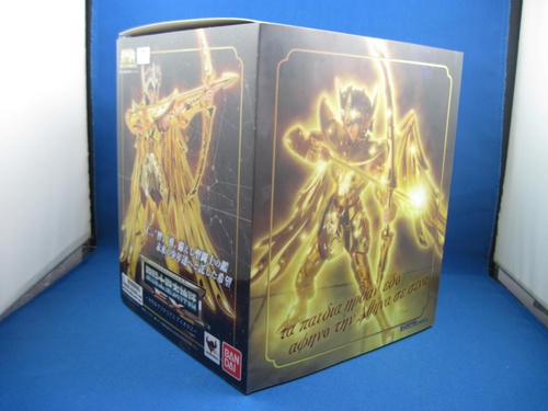 You wait for a smaller, less expensive equivalent, of course. The Myth Cloth EX is a new line separate from Myth Cloth: the figure is bigger, there's more articulation. This one in particular will run you about a hundred dollars-- but in a world where a normal toy costs $50 it's not that insane. Especially because this is quite a deluxe piece: look at this fancy box! What you see here is a transparent plastic slipcover for the box. The message in Greek on the right side is from the show: I know this because of wiki research.