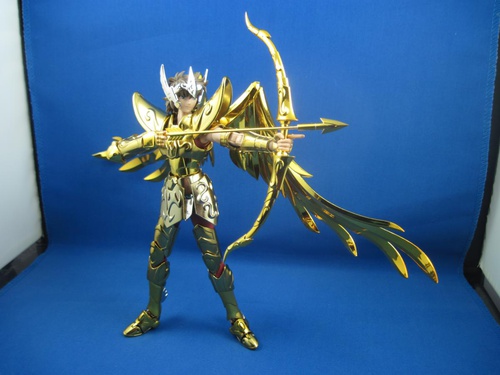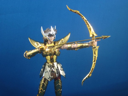Aiolos' armament, befitting the Sagittarius constellation, is a golden bow. This, too, is a delicate assembly: in particular, the arrow is just barely held in a tiny slot between the fingers. When you're completely done with this figure, you're probably going to want to display it this way, so be just be very careful setting it up and it should stand on its own.