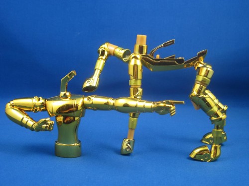 And now the base armor is complete. The arms and legs are significantly easier to get on: just take off the arms and legs and slide on. Once I got this thing together I was completely bowled over. The gold shines so bright I had to lower the lights and change my camera settings. It's heavy: except for the elbow and knee caps, the crown, and a few other small detail bits, every piece of Aiolos' gold armor is solid metal. Picking up a Super Robot Chogokin after handling this, the robot feels light. Most importantly, once on, the armor stays put where it's supposed to, dammit.