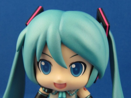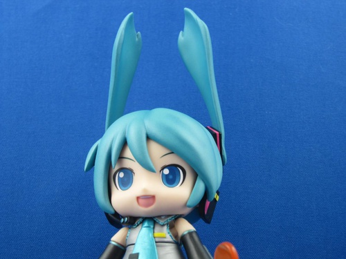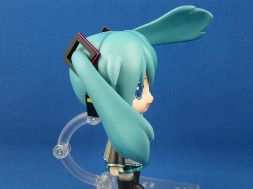 The hair has sort of a spraypaint-metallic finish, likely intended to evoke the weird foamy material that the mascot costume is made out of. Again, to mimic the costume, the twintails are made of plastic that's floppy like a dog's ears. This effect is vaguely surreal and perhaps my favorite thing about the figure.