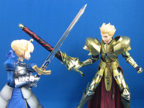 Gil is both more heavily armored and quite a bit taller than Saber (the two figures are in scale with each other, and stand at a comparable height to a Figma), Along with the shipping weight, this likely explains the higher cost: Saber will run you around $80 and Gil around a hundred.