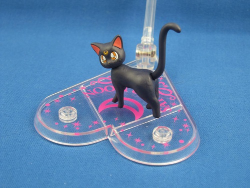 You also get a little Luna, in the form of a fixed-pose figure. Note her tiny paws, because this kitty does not keep her balance well at all unless she's on a completely hard, flat surface like a table. Even on the cloth surface of our lightbox, which most figures have no issue with, completely defeated her. If you do get Luna standing, she will definitely tip over. She fell over seconds after this photo was taken. It was nice of them to think of Luna, but this is a lousy little thing.