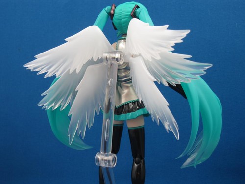The wings are semi-transparent plastic in a ghostly milk white. Just put it between Miku and the stand, using the included plug. Problem with that is that the stand, as stated before, is terrible and will not stay put in Miku's back, especially with the wings on there. The wings have three sections of “feathers” that move.
