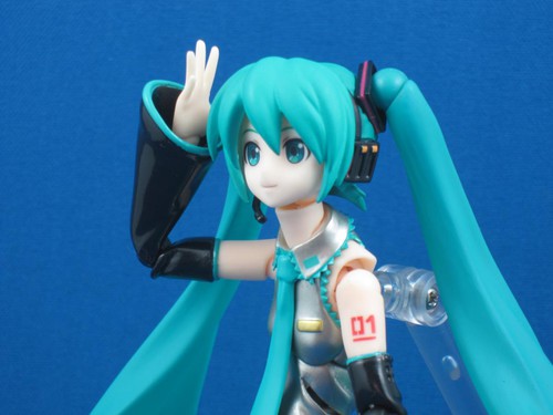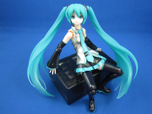 Also, the “hidden” articulation under the chest that is now common to most figmas has been added. In fact, the torso has two different joints, with the second one hidden in a wrinkle in Miku's top at the lower back. With a lower back that actually bends somewhat, it's simple to get Miku into a convincing sitting position on an item of suitable size... like say my DX Mazinger's remote control.