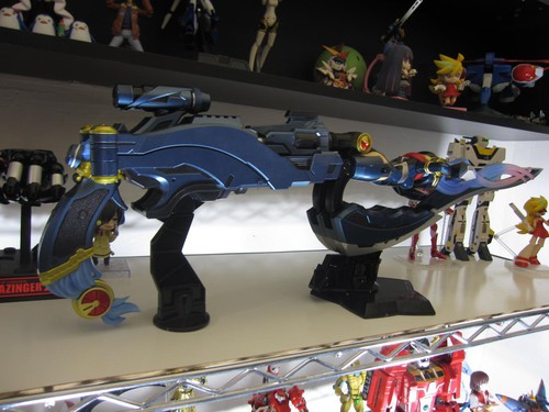 Behold the Munyu Moe Zubakyu~n, the ultimate weapon. The Moe Bayonet. Do I need to explain to you how incredible this is? There are, again, sounds and lights when you connect the two weapons. The combined monster is basically a rifle and completely too huge for our photo setup.As you can see I had to clear off my entire top shelf, where two RAH figures and DX Mazinger usually reside, just to take a proper picture.