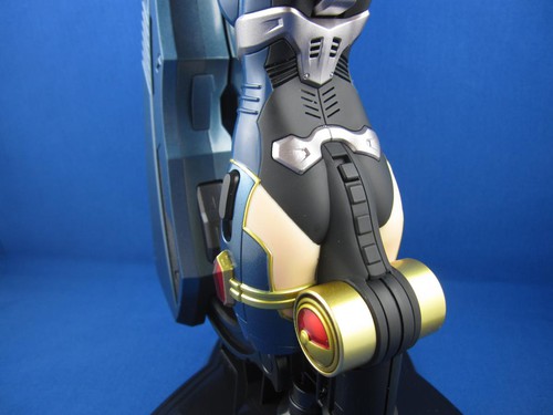 Of course it transforms! Fold out the legs and hair and you can more clearly see Aoi-tan, standing very tall at 36cm. Again, this is probably the tallest thing we've reviewed. There's a little give in the shoulders so that everything will fit together right, but it's effectively a fixed-pose figure, same as the one on the show. Don't yank on those arms and definitely refer to the manual. It's not the most beautiful PVC figure you ever saw, but as you can see in that previous video, neither is the show prop. That's kinda part of the joke.